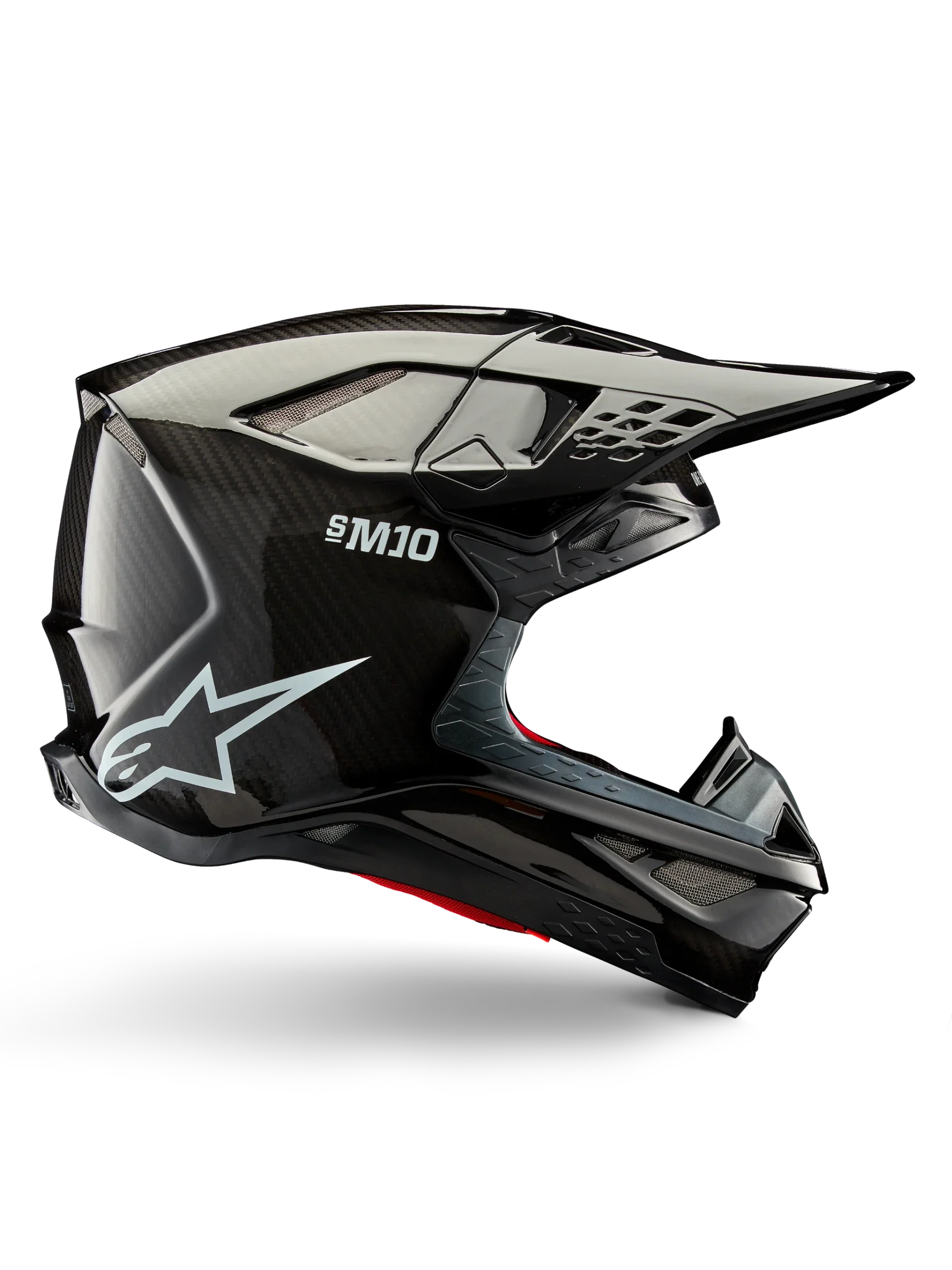 Het doel van de Alpinestars Supertech-familie van helmen was om de meest geavanceerde, beschermende en prestatieverhogende helmen mogelijk te maken voor rijders wereldwijd. Met de S-M10 heeft het Helm Ontwikkelingsteam van Alpinestars de helm zo ontworpen dat deze de perfecte mix biedt van uitstekende ventilatie en ongeëvenaard comfort, om een helm te creëren met het lichtst mogelijke gewicht, zonder concessies te doen op enig ander front.Het ontwerp van de S-M10 biedt een glad, aantrekkelijk, aerodynamisch profiel dat gestroomlijnd is en vrij van externe kanalen en kenmerken die als belastingpunt kunnen fungeren bij een impact of de algehele integriteit van de helmconstructie kunnen compromitteren. De oppervlaktecurvatuur bevordert verminderde wrijving bij impact, waardoor afbuiging en de meest efficiënte overdracht van energie mogelijk zijn om het hoofd van de rijder te beschermen tegen directe kracht op de schedel en doorverwezen naar de nek en wervelkolom.